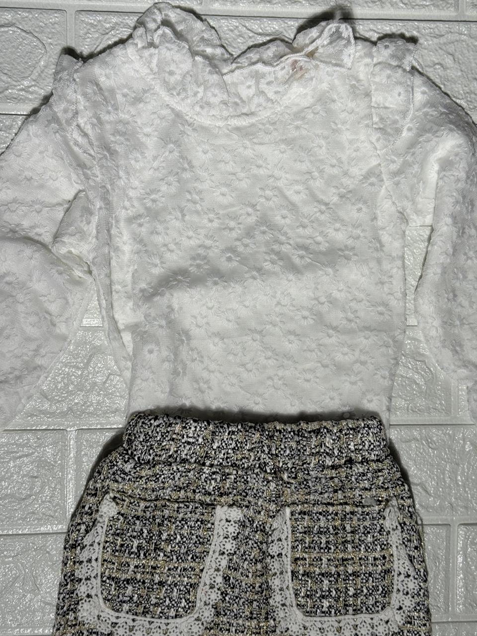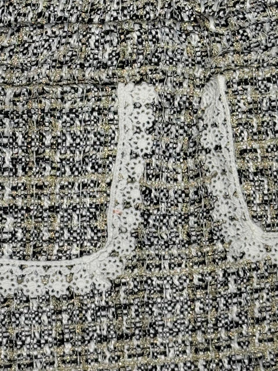 👗 Skirt: Stylish tweed mini skirt with front pockets trimmed in lace detailing, offering both sophistication and comfort.