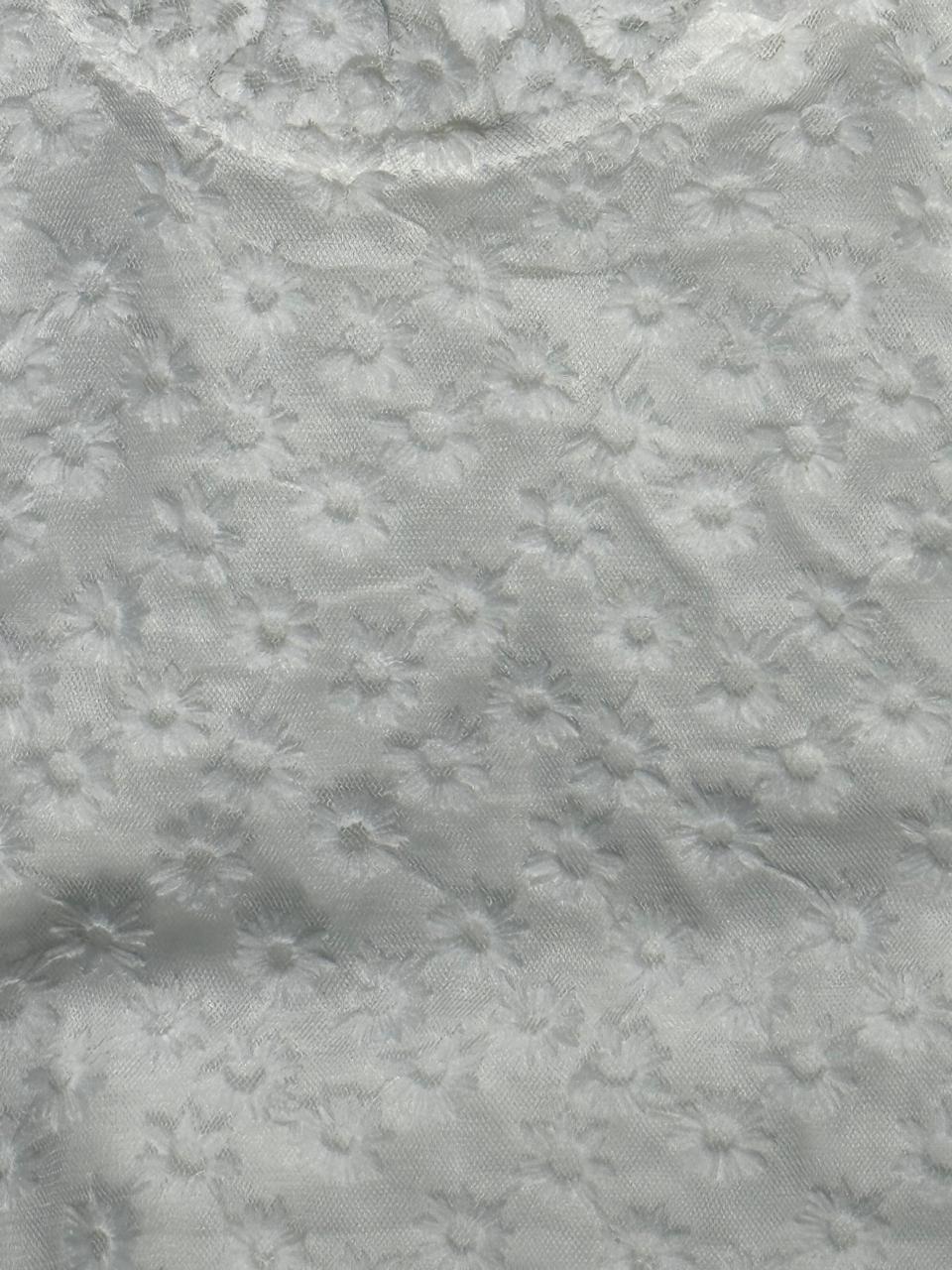 👚 Top: A delicate white lace blouse with soft floral patterns, ruffled neckline, and puff sleeves for a charming vintage touch.