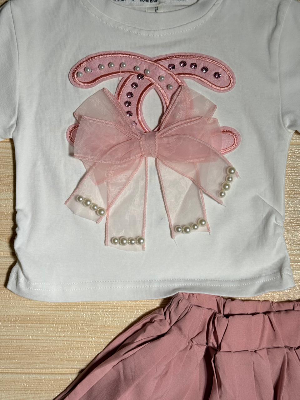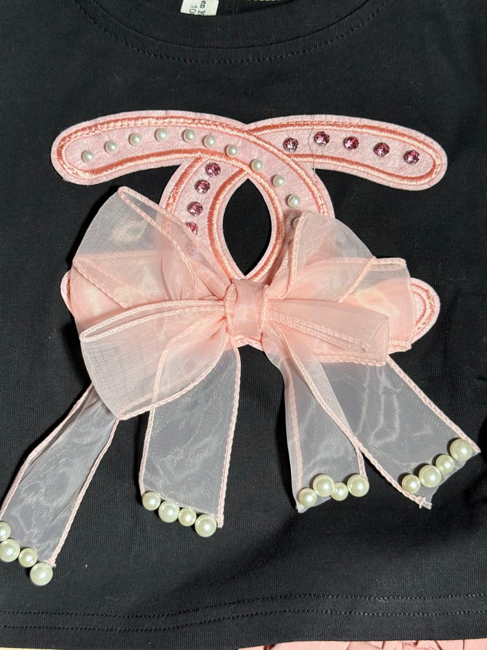 Dress your little one in style with this charming two-piece outfit! The soft black cotton top features a delicate pink organza bow accented with tiny pearls and sparkling studs, giving it a touch of elegance. Paired with a dusty pink layered pleated skirt, this set offers the perfect mix of comfort and cuteness for any occasion — from birthday parties to casual outings.