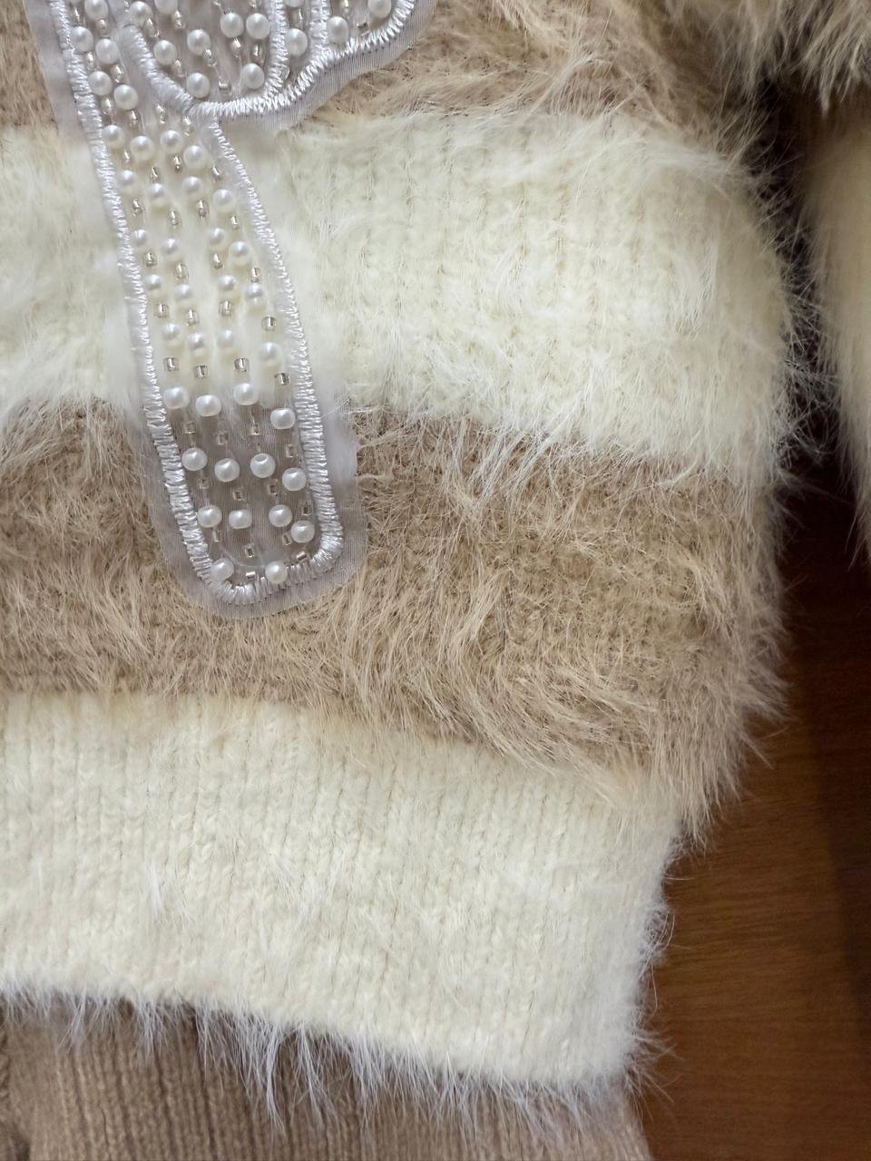 Dress your little one in timeless elegance and comfort with this beautifully coordinated winter outfit. Featuring a soft, fluffy knit sweater in warm neutral tones, this piece is highlighted by a delicate pearl-embellished bow design that adds a charming, classy touch.