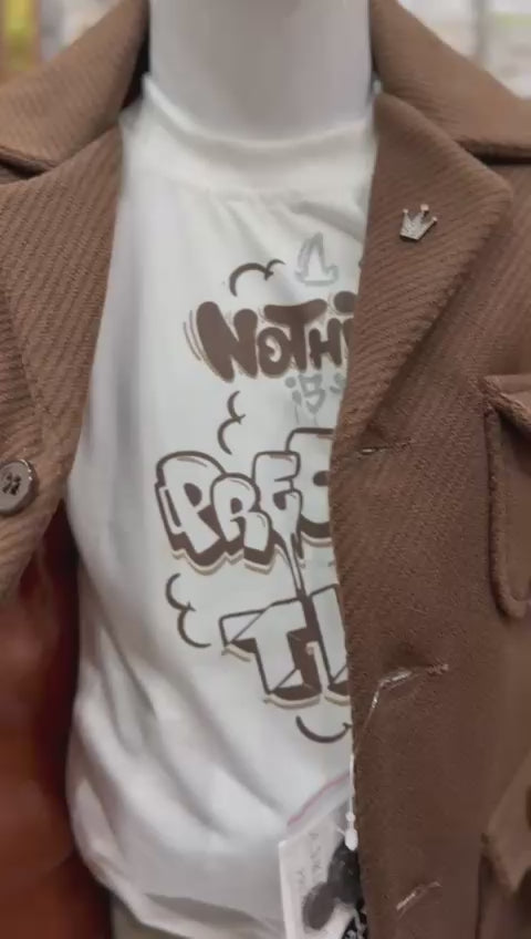 This smart and elegant outfit is perfect for dressing your little boy in a classy yet comfortable look. It features a premium black textured jacket with a tailored fit, highlighted by flap pockets and button detailing for a refined finish. The jacket is paired with a soft printed white T-shirt, adding a playful touch beneath the formal layer.