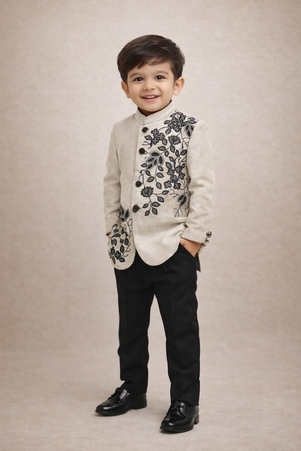 Paired with smart black trousers, the outfit achieves a perfectly balanced look—stylish yet age-appropriate. Ideal for weddings, festive celebrations, receptions, and special occasions, this ensemble gives a cute, handsome, and polished appearance, making it perfect for a studio photoshoot or grand event wear.