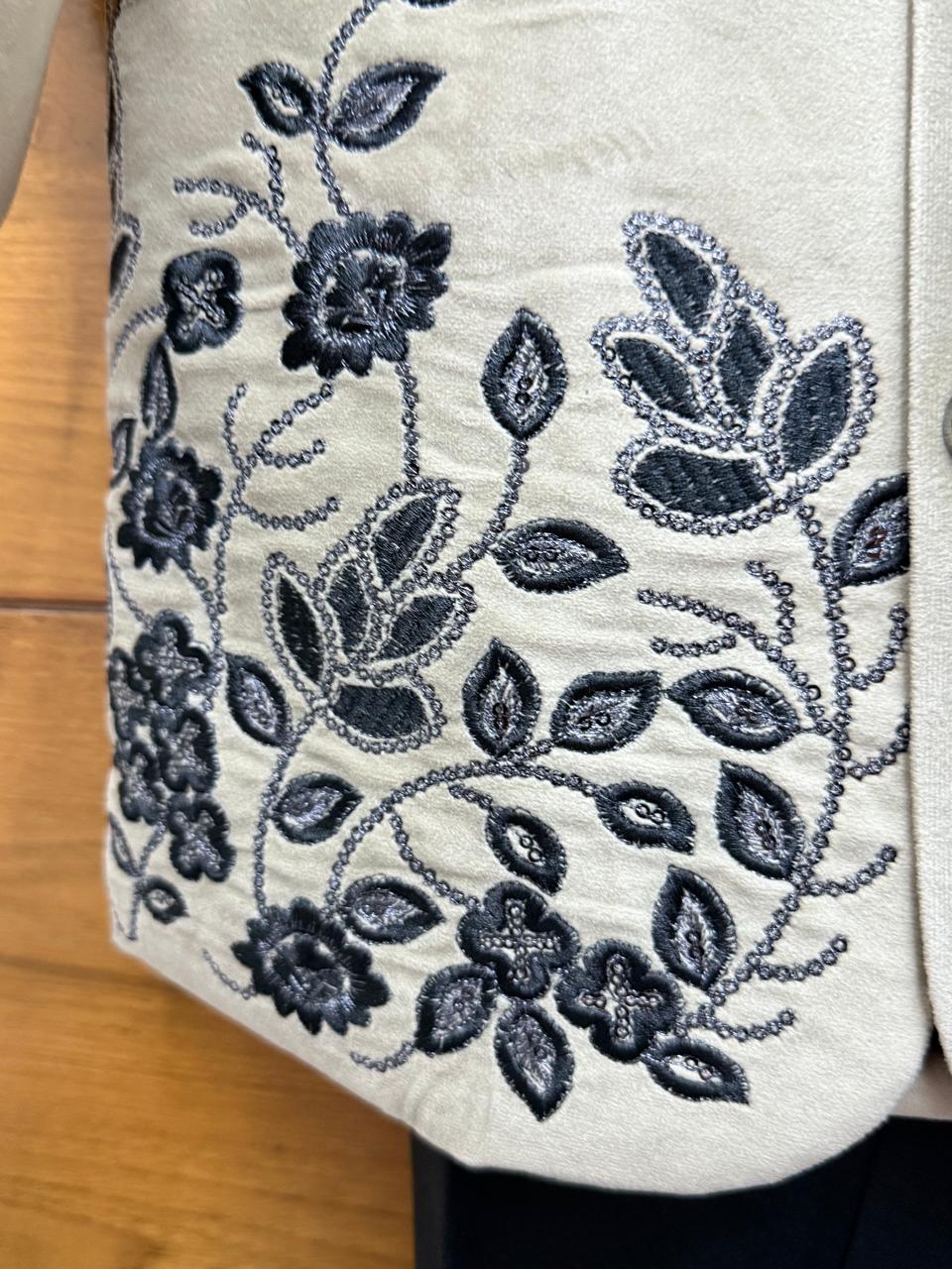 This elegant boys’ ethnic outfit features a beautifully tailored off-white sherwani designed for a refined and festive look. The sherwani is crafted from a soft, premium fabric with a subtle sheen, offering both comfort and sophistication. Intricate black floral embroidery adorns the front panel, shoulder, hem, and cuffs, creating a striking contrast that enhances the overall design. The classic mandarin collar and decorative buttons add a traditional touch with a modern finish.