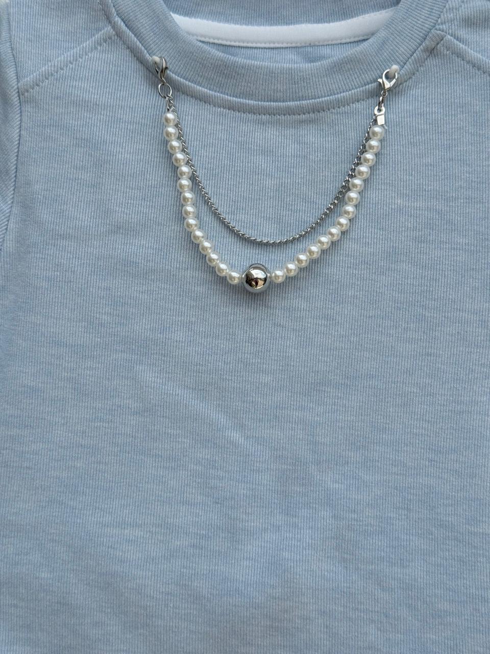 👕 Top: Soft cotton short-sleeve t-shirt with a trendy asymmetrical hem design. Comes with a cute detachable pearl necklace for a touch of elegance.