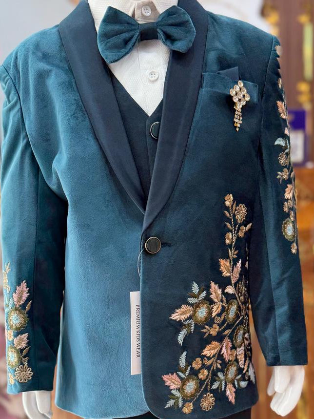 Kids Boys Luxury Velvet Suit with Embroidered Blazer & Bow – Party Wear