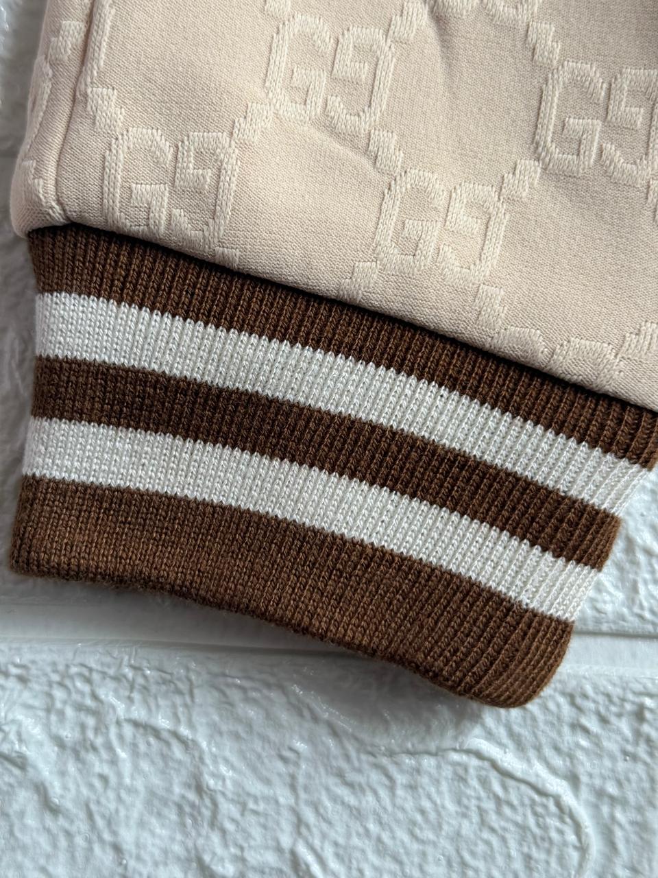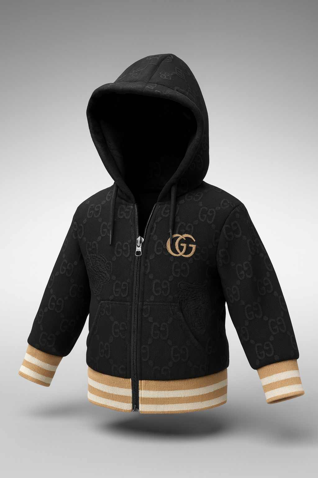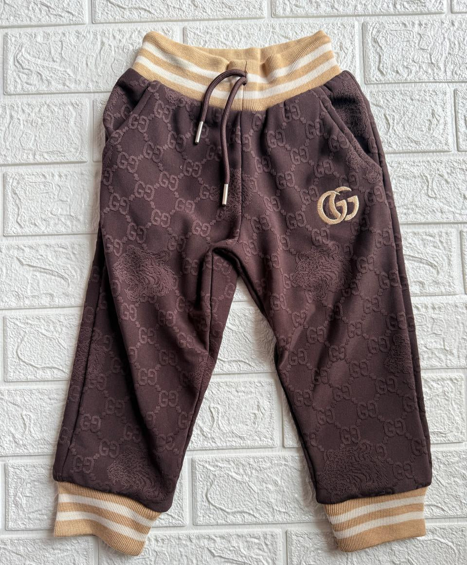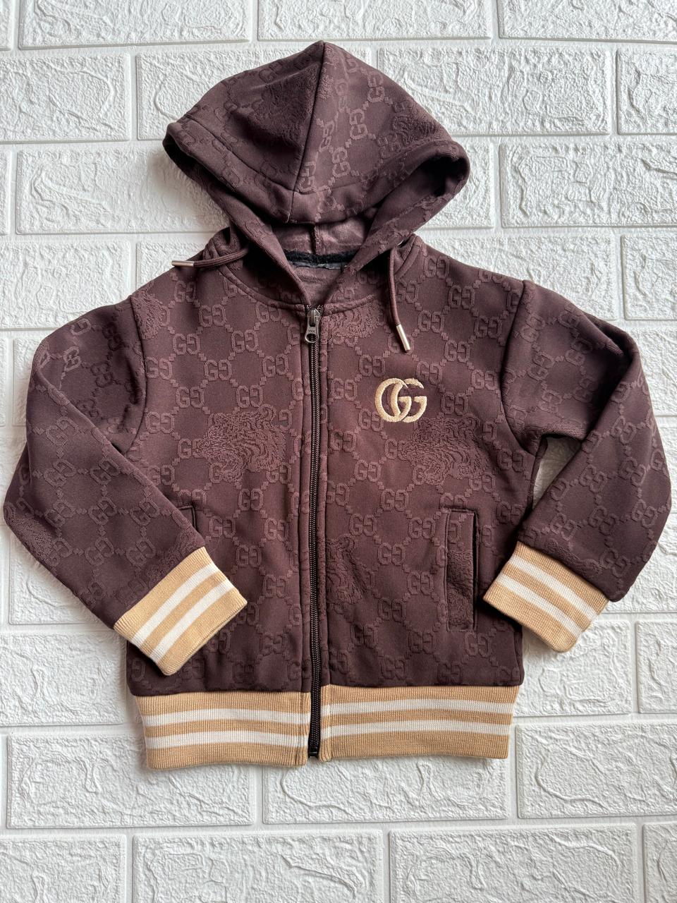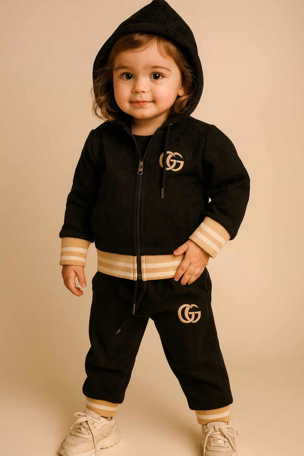Dress your little champ in style with this premium designer hoodie & jogger set. Crafted in rich chocolate brown with subtle embossed patterns and signature GG logo detailing, this outfit blends comfort with luxury.