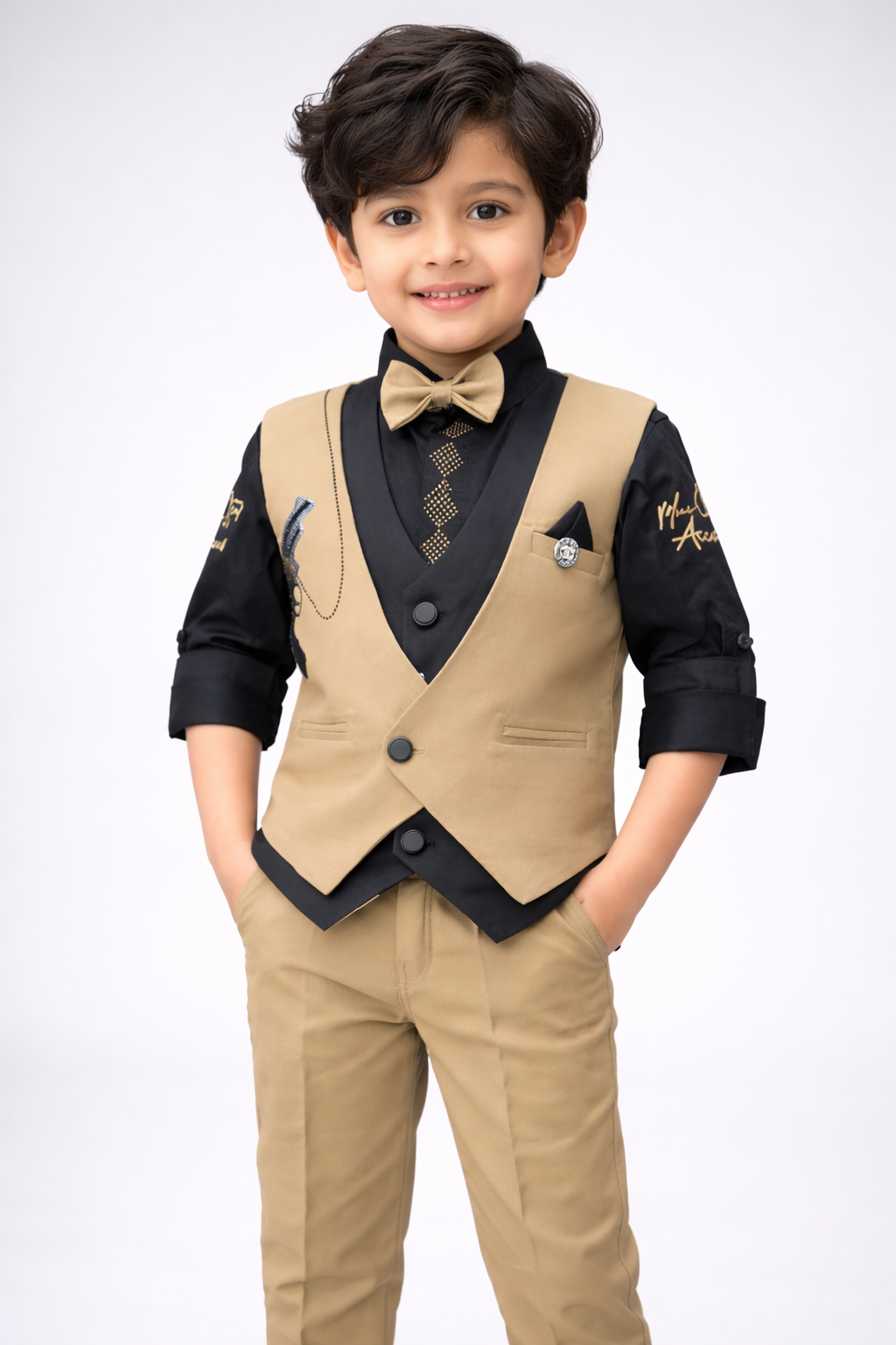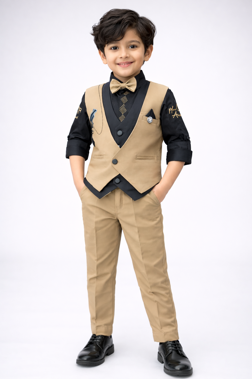 Make your little prince look super cute and handsome with this classy beige & black formal suit set. It comes with a stylish beige waistcoat, smart black shirt, matching bow tie, and comfortable beige pants for a complete royal look. The elegant design and perfect fitting make it ideal for weddings, birthdays, functions, and festive occasions. Soft fabric keeps your baby comfortable while still looking premium and stylish. A perfect outfit for photoshoots and special events that will make everyone say “wow”! 👑💛