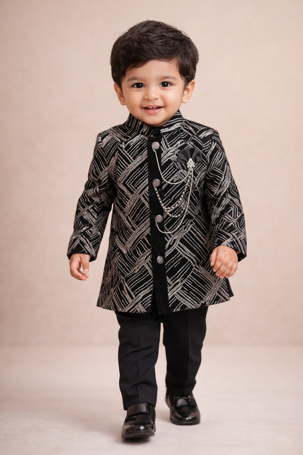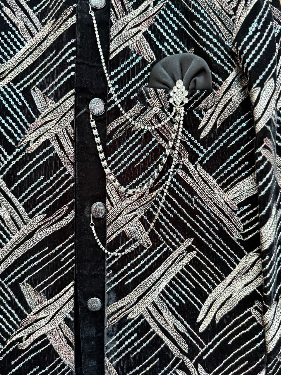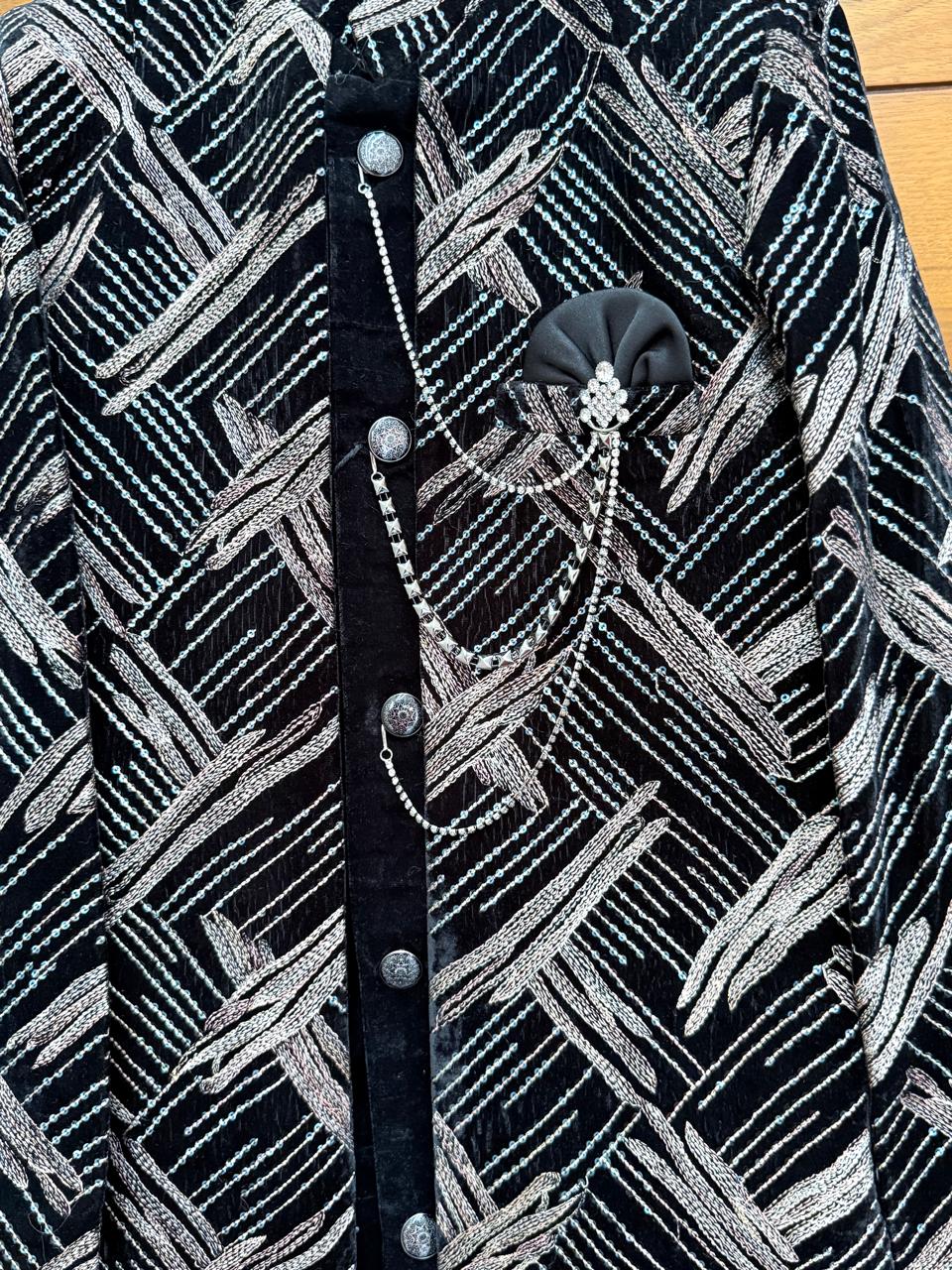 Make your little one stand out with royal elegance in this Luxury Boys Velvet Embroidered Sherwani Set, designed for kids aged 1 to 6years. Crafted from premium velvet fabric, this sherwani features rich metallic embroidery in a modern geometric pattern, giving it a classy and sophisticated look.