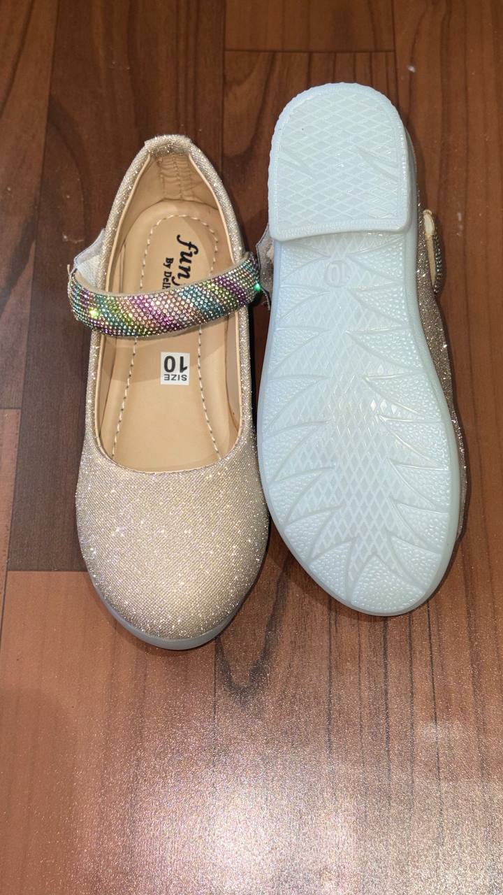 These stunning glitter-finish Mary Jane shoes feature a soft shimmering upper and a multicolor crystal-effect strap that adds a playful yet elegant touch. Designed with a comfortable cushioned sole and secure strap, they are perfect for birthdays, weddings, parties, and festive celebrations.