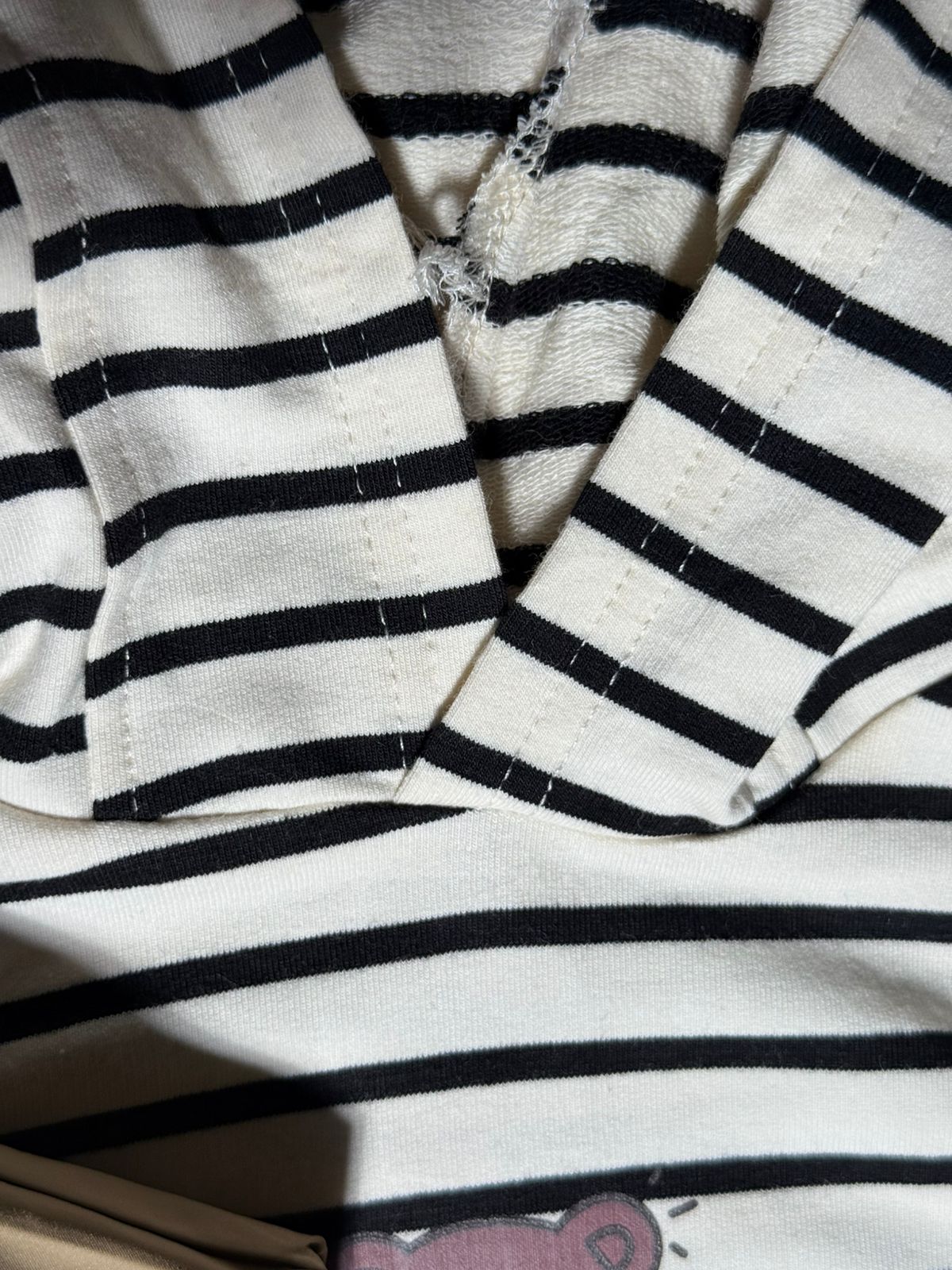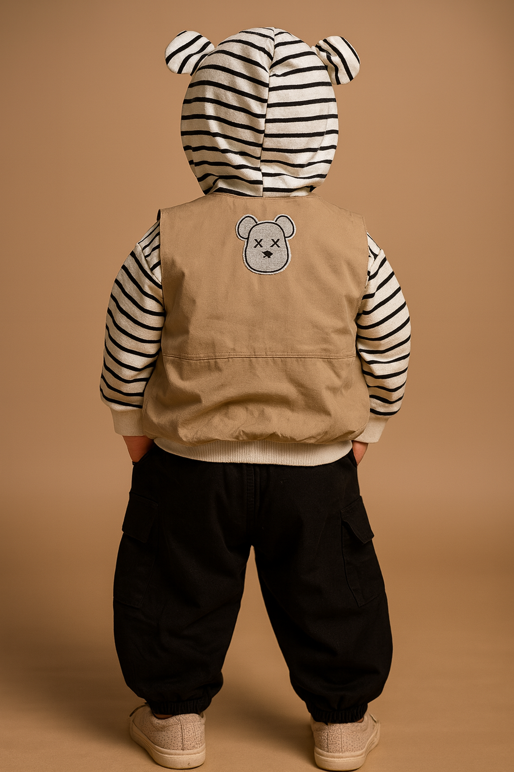 Trendy 2-in-1 look: Striped hoodie with adorable bear ears paired with a sleeveless beige vest for a layered, fashionable style.