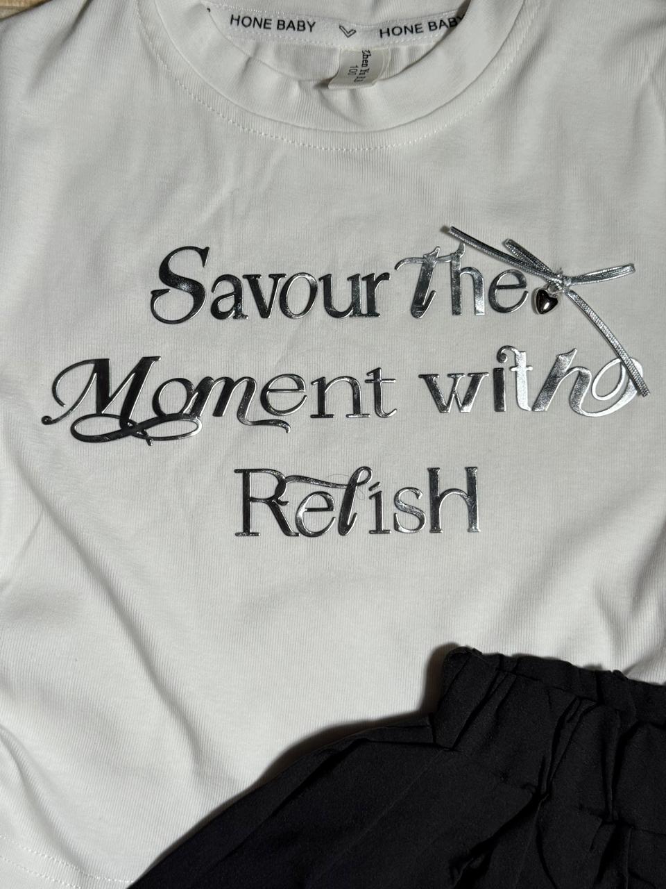 👚 Top: A soft black t-shirt with a shiny silver embroidered quote — “Savour the Moment with Relish”. Made from breathable cotton for all-day comfort.