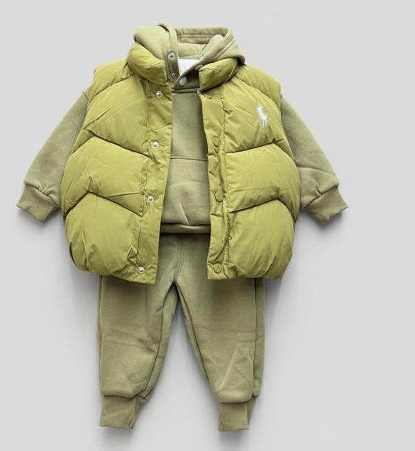 Keep your little one warm and effortlessly stylish with this premium winter outfit. This adorable set features a soft fleece hoodie paired with matching jogger pants and a lightweight padded sleeveless jacket for extra warmth. Designed for comfort and everyday wear, it’s perfect for outings, playtime, and casual occasions.