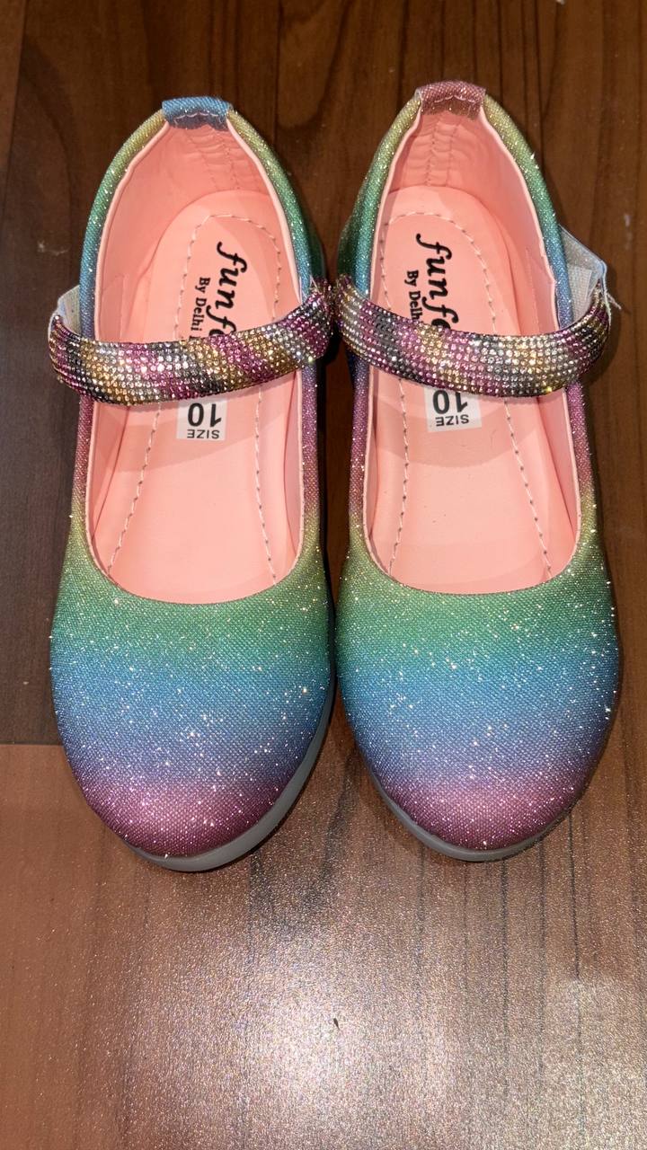 These beautiful rainbow gradient Mary Jane shoes feature a soft glitter-finish upper paired with a shimmering multicolor strap for a fun, magical look. With a comfortable cushioned insole and secure fit, they are perfect for birthdays, parties, weddings, and festive occasions.